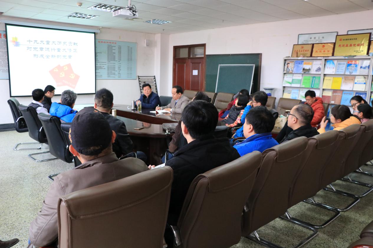 张立兴书记以党的十九大精神后党章的新变化为切入点,结合中共思想政治路线,围绕党章的重大历史贡献、新时代特色以及学习新党章做合格党员三个方面,对新党章进行全面细致的解读,并以“八个空前强调”对时下新形势进行剖析:空前强调“党”领导一切、空前调“政治”首位、空前强调“人民”至上、空前强调“文化”价值、空前强调“从严”管党治党、空前强调“共同体”意识、空前强调“强国”目标、空前强调“支部”功能。随后,张立兴书记列述了习近平总书记及往届中央领导人的成就,分析了他们在中国近代化发展过程中起到的作用。他指出,当前中国正处在历史转折的关键阶段,作为一名党员,必须要提高自己的思想觉悟,加强政治性、廉洁性建设。最后,张立兴书记号召教师党员应以优秀党员为榜样,不断强化政治修养,提升人格魅力。会后,与会党员纷纷表示,要自觉遵守党章、贯彻党章、践行党章,争做新时代合格党员。