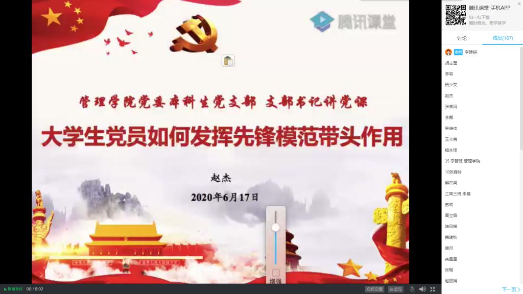 6月17日,NBA直播88篮球 党委本科生党支部依托腾讯课堂,召开主题为《大学生党员如何发挥先锋模范带头作用》的党课会议,支部书记赵杰担任主讲,支部全体成员及入党积极分子参加会议。