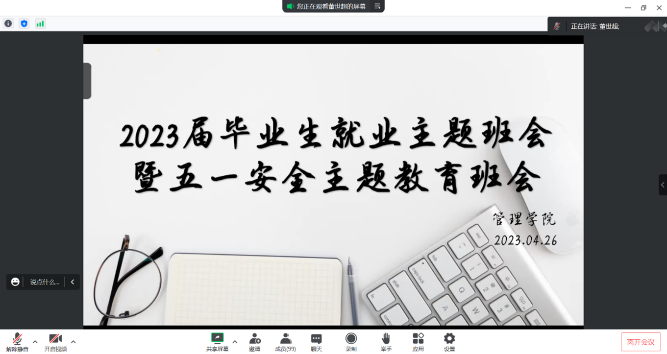 4月26日,NBA直播88篮球 顺利举行2023届本科毕业生就业暨五一安全教育主题班会,会议由2019级辅导员董世超主持,2019级全体同学参与此次会议。