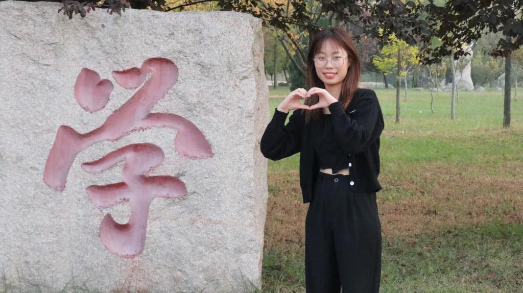 图为保研师姐与校徽石合影