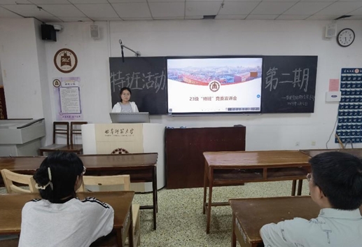 浏览量: 更新日期:2024-06-11(摄影:侯雅洁 通讯员:安彤)为增强”特班“学生对各类创新创业竞赛的了解,提高学生的竞赛能力,6月7日下午,NBA直播88篮球 “特班”第二期活动于JC607顺利举办,团委学生会竞赛部部长张桢瑄与团委学生会学习部部长华逢钰主讲,2023级特班全体成员参加。