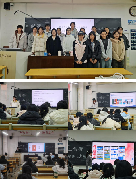 专题培训聚焦“拆解竞赛逻辑+分享竞赛经验”的核心目标,分三个环节推进。第一环节聚焦“赛事解读”,申雨涵围绕三创赛的核心赛道分类、赛事流程及关键时间节点进行详细讲解,结合政策解读与实际案例梳理参赛方向,帮助同学们精准把握赛事要点;第二环节为“经验分享+互动答疑”,特邀陈梓毓、史军涛、徐莨懿、周蓓这四位往届三创赛优秀获奖代表进行经验分享,他们结合自身参赛经历,从项目选题、团队组建、文书撰写、答辩技巧等方面分享实用经验,并针对备赛中的重难点问题与现场同学深入交流,互动氛围热烈;第三环节,全体人员合影留念,为本次活动画上圆满句号。