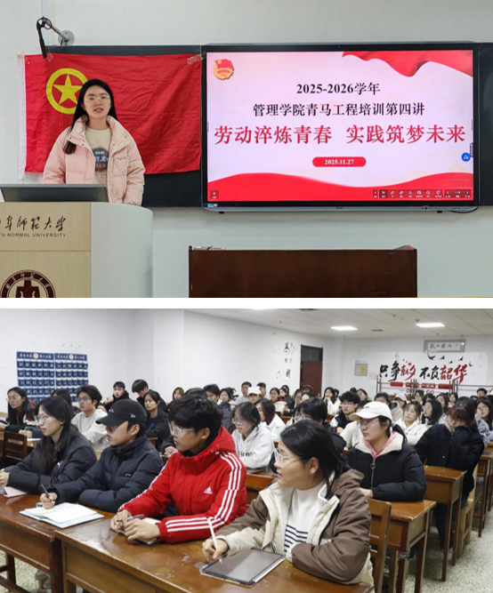 浏览量: 更新日期:2025-12-18为深化劳动教育的时代内涵,推动青年群体在实践锻炼中成长成才,11月27日,NBA直播88篮球 团委顺利举办“青马工程”培训班第四讲,本次培训的主题是“劳动淬炼青春,实践筑梦未来”,培训会由2025级辅导员吕敏主讲,全体学生干部参与。