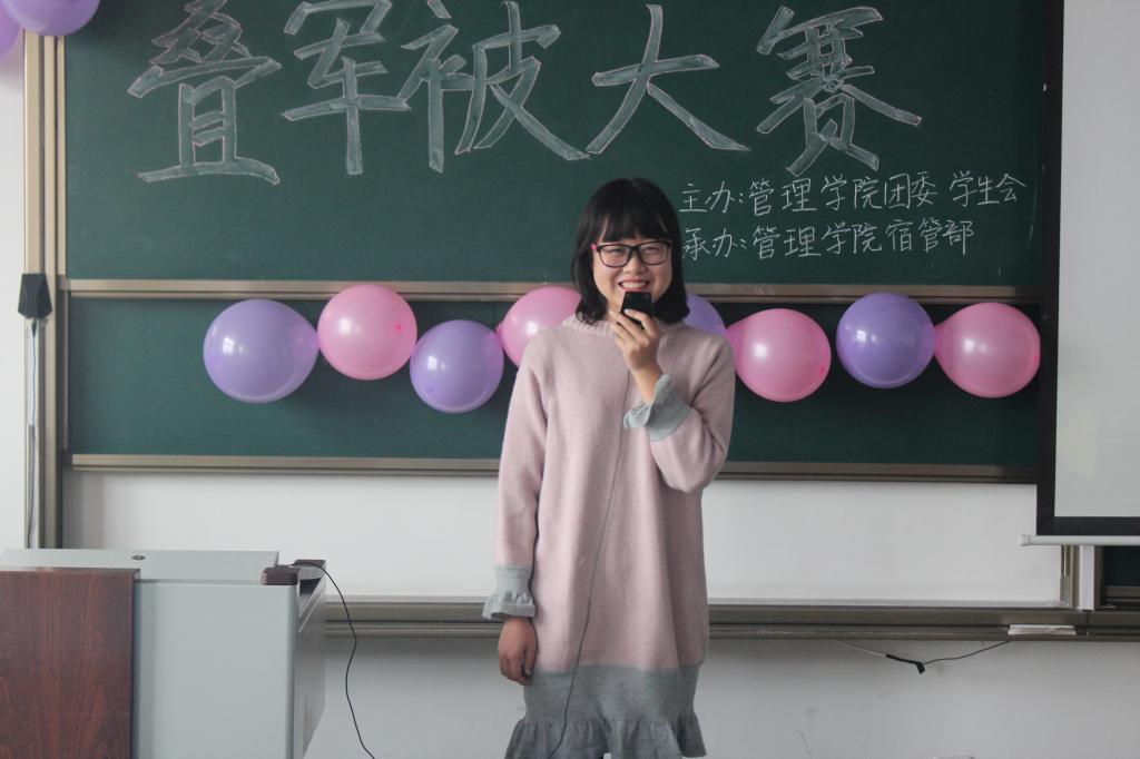 由主持人简单介绍规则后,参赛同学根据抽签顺序依次上前大展身手。同学们信心满满,伴着悠扬的音乐,被子在他们手中折的游刃有余,一床普普通通的被子不一会儿就变成整整齐齐的“豆腐块”,而后耐心细致的他们勾角、拉边,一个个方块被赢得了观众的阵阵掌声,段希倩的一首《在树上唱歌》缓解了现场比赛同学的紧张,调动了现场气氛。最后,2015级的十佳叠被子能手的娴熟展示为比赛拉上帷幕。