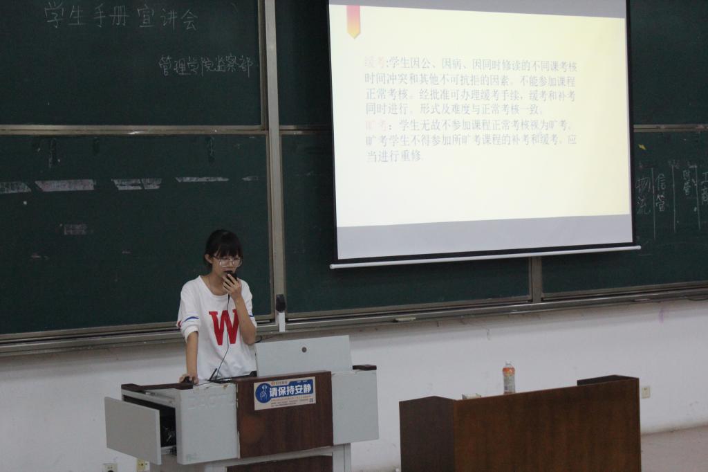 为帮助广大新生尽快适应大学生活,熟悉学校管理规定和评奖评优办法等相关内容,9月20日晚7点,NBA直播88篮球 监察部于JE101顺利开展《学生手册》宣讲会。