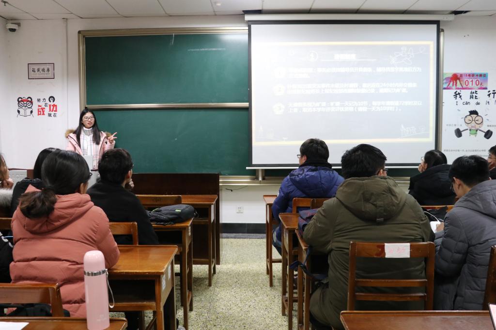 为促进88篮球 学风建设,12月13日下午,88篮球 于JC108就新制定的《NBA直播88篮球 学生考勤管理制度》进行了集中学习。15、16、17级各班班长、纪检委员以及学生会纪检部全体成员参与了此次学习。会议由纪检部部长石维洁主讲。