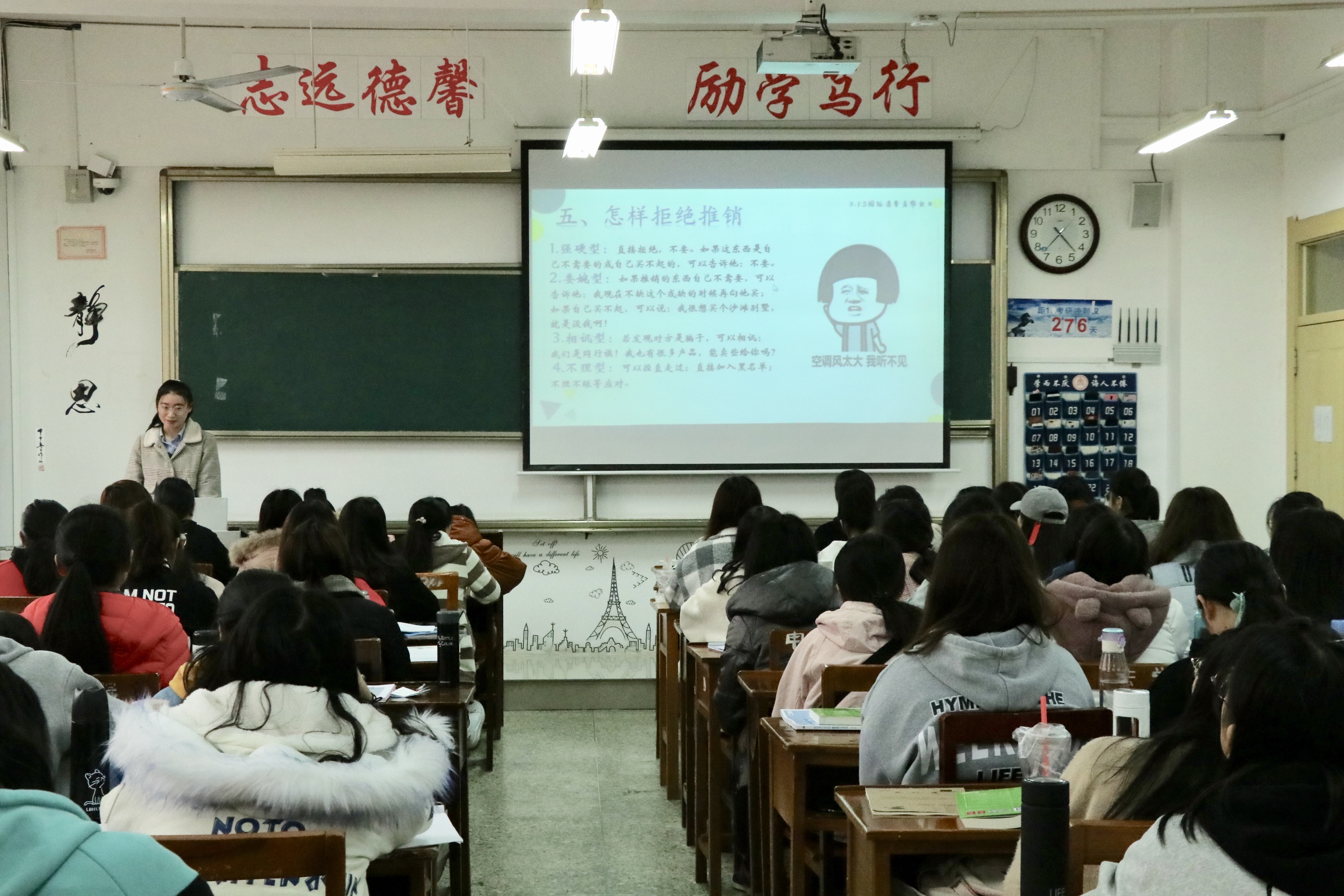 活动伊始,宣讲人以国际消费者权益日由来为引线,清晰、严谨地介绍了315消费者维权投诉流程。宣讲会深入浅出地分析了假冒伪劣商品的危害,以小见大,并针对网络诈骗行为、恶意推销等问题,为学生提供合理、正确的维权方法和途径,告诫学生在权益受侵害时应及时拿起法律武器,保护自身合法权益,坚决不做沉默的羔羊。宣讲会在2019年央视315晚会视频中拉下序幕。此次维权宣讲会,学生们专注聆听,获益匪浅。会后,权益部收集了学生填写的维权困惑与疑问卡片,并做出全面、详细地解答。