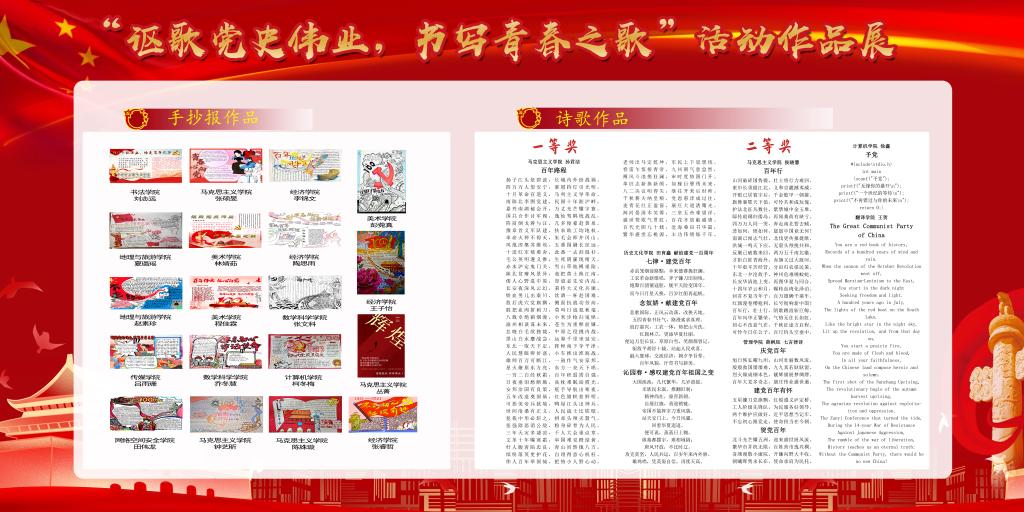 本次活动鼓励学生围绕建党100周年创作诗歌、文章、手抄报等文字作品。经过评审工作小组认真的审核和评审,共评出文章类作品一等奖2名、二等奖6名、三等奖15名、优秀奖15名;诗歌类作品一等奖2名、二等奖4名、三等奖13名、优秀奖12名;手抄报类作品一等奖1名、二等奖3名、三等奖8名、优秀奖10名。所有获奖作品在多个平台同步展示宣传。