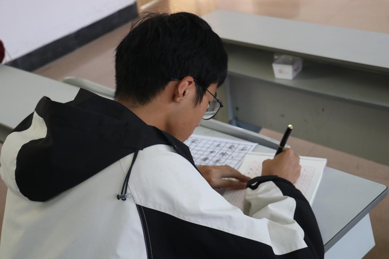 本次比赛共设钢笔字,毛笔字,粉笔字三个专项。大赛伊始,主持人向参赛选手们介绍了比赛规则和注意事项。随后,参赛选手根据自己报名的项目进入不同的教室参加比赛。选手们坐姿端正、握笔正确,毛笔笔法精妙,结字灵动;钢笔横平竖直,结构匀称;粉笔笔画规范,赏心悦目。他们全心投入、精心书写,于字里行间挥洒书写之豪气,尽其所能地展示自身的书法才能。最后,作品完成后由学习部成员拍摄留存并对所有未署名的书法品进行评分,每个项目选取前三名选手推荐进入校级比赛。