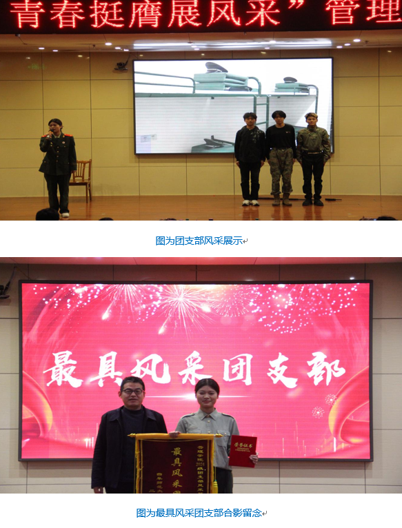 本次活动由团支部风采展示、节目汇演和颁奖三个环节组成。首先,各班级代表依次上台介绍班徽班训、班级公约并播放班级MV;随后,各团支部通过话剧、小品、诗朗诵、舞蹈、合唱等多种表演形式,展现出管院学子奋发进取的青春面貌;最后,经过激烈的角逐,工商管理二班荣获“最具风采团支部”荣誉称号,财务管理一班、物流管理一班荣获“卓越创意团支部”荣誉称号,物流管理二班、财务管理二班、工商管理一班荣获“最佳组织团支部”荣誉称号。