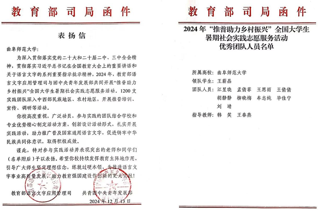 据悉,本次活动共有1200支实践团队入选2024年“推普助力乡村振兴”全国大学生暑期社会实践志愿服务活动团队名单。活动结束后,教育部语言文字应用管理司和共青团中央青年发展部根据活动开展情况,对不超过20%的优秀团队予以表彰,曲阜师大NBA直播88篮球 “情系桑梓,言通华夏”实践团队荣获全国大学生暑期社会实践志愿服务活动优秀团队。
