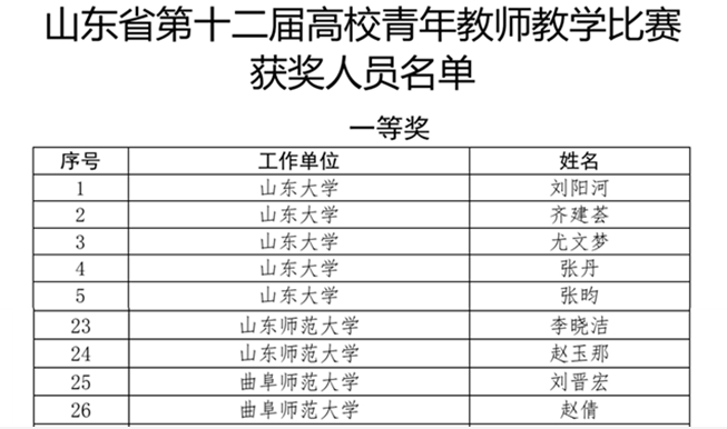 浏览量: 更新日期:2025-05-23近日,山东省第十二届青年教师教学比赛落下帷幕,88篮球 刘晋宏荣获一等奖。这是继刘金发教授2019年获山东省第六届青年教师教学比赛一等奖之后的又一荣誉。