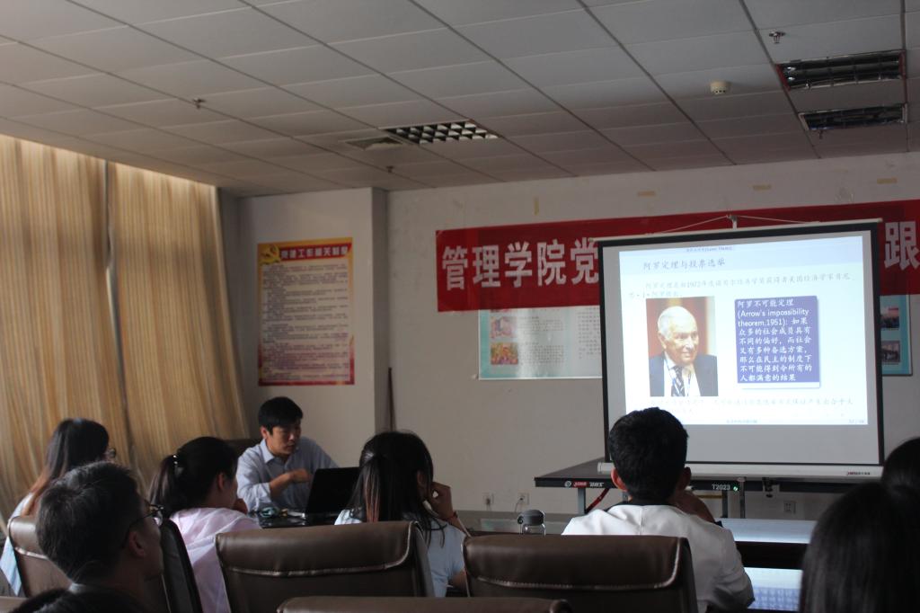 在此次报告中,韩教授谈到博弈无处不在,它存在于我们的日常生活中。韩教授在报告中讲述了几个应用博弈的例子,“阿罗定理”、“投票悖论”、“塔木德分配定律”以及“囚徒困境”,这些例子生动有趣,吸引了学生与老师的眼球,让我们感受到了博弈的精巧与运筹帷幄的快感。