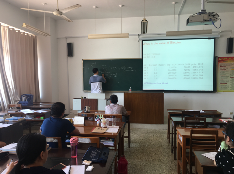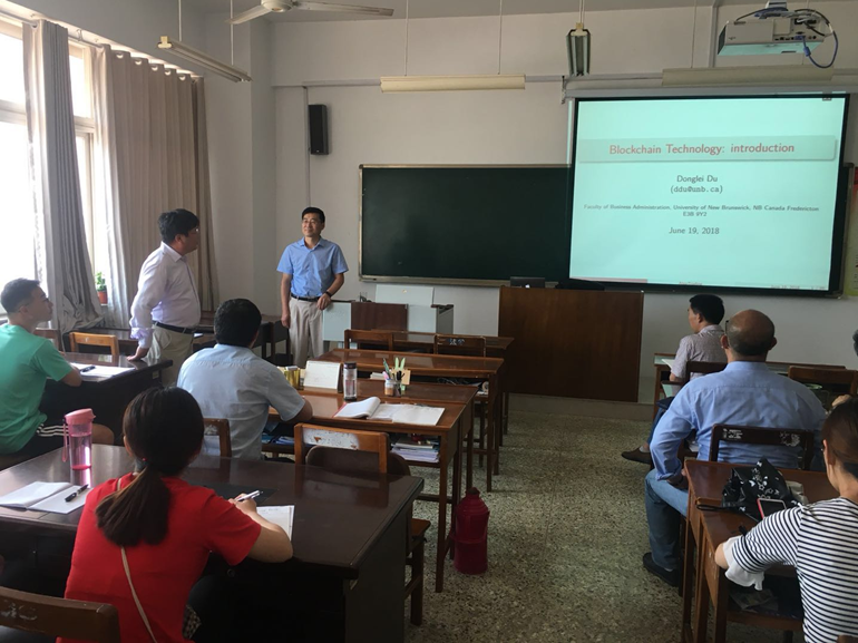 浏览量: 更新日期:2018-06-236月20日—6月22日,加拿大新布朗什维克工商NBA直播88篮球 副院长杜东雷教授应运筹学研究院邀请来曲阜师范大学NBA直播88篮球 ,做了题为“BlockChain Technology”的系列专题讲座,本专题讲座以比特币为主要事例,介绍区块链技术的基本概念,机制及应用。讲座由曲阜师范大学运筹学研究院院长张玉忠教授主持。