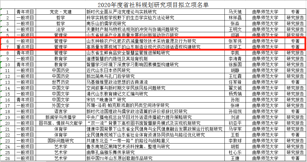 浏览量: 更新日期:2020-03-07日前,山东省社会科学规划管理办公室公布了《2020年度山东省社会科学规划研究项目拟立项名单》,此次曲阜师范大学共获批26项,NBA直播88篮球 获批2项。其中,李学工教授的“高质量发展视域下的山东制造业现代供应链话语权构建研究”课题获批山东省社科规划研究重点项目,为此次获批的全校唯一一项重点项目;张军伟博士的“山东种粮农户化肥农药减量增效技术采纳意愿及行为研究”获批山东省社科规划研究一般项目。