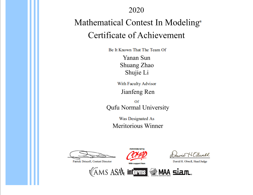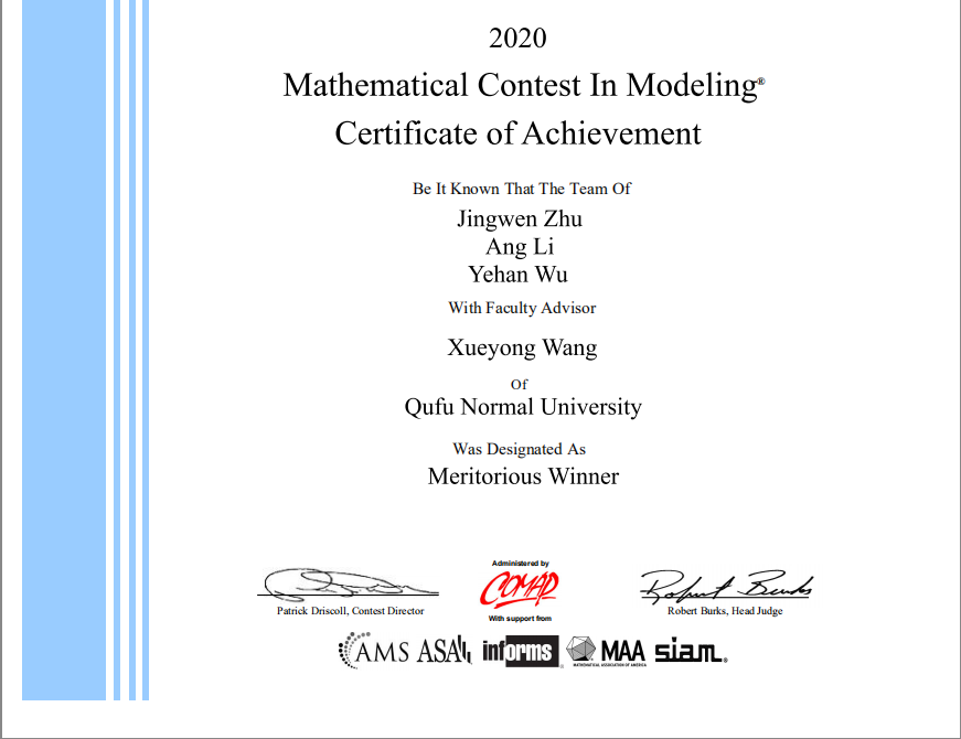 浏览量: 更新日期:2020-04-28近日,2020年美国大学生数学建模竞赛成绩揭晓,NBA直播88篮球 共计4个团队参赛,其中2个团队荣获Meritorious Winner奖,2个团队荣获Successful Participant奖。