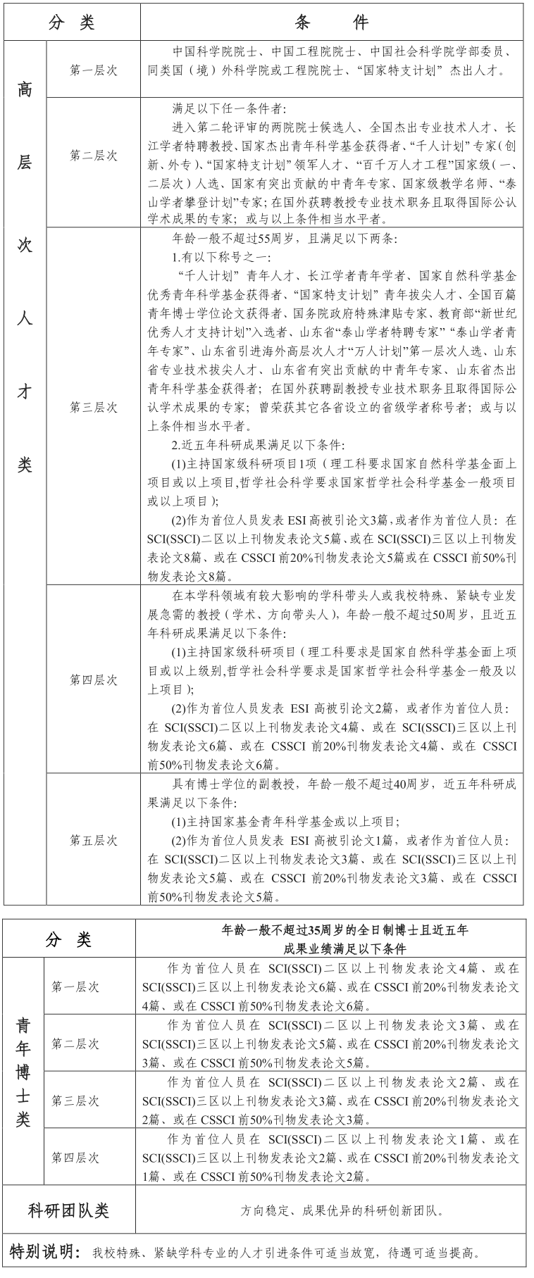 一、引进各类别人才的层次、条件